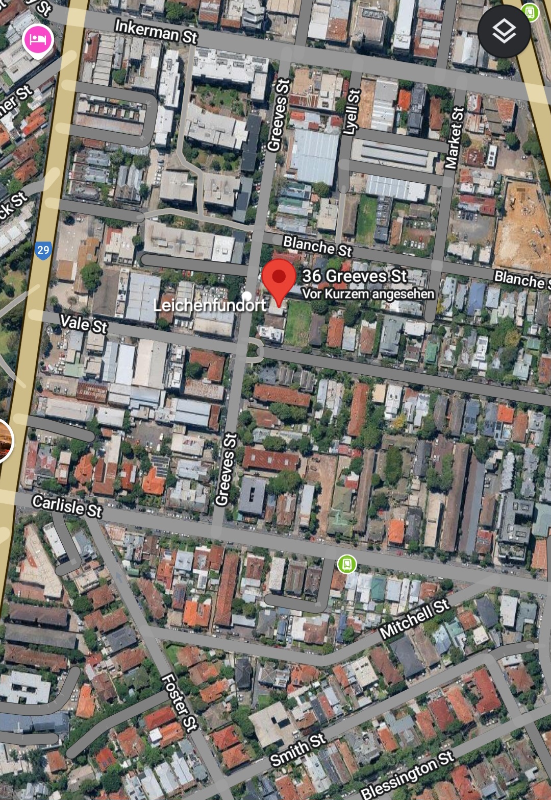 | Der Tatort und der Leichenfundort befanden sich im Juli 2013 in der Greeves Street, gegenüber der Greeves Street 36 in St. Kilda. Foto: Google Maps |